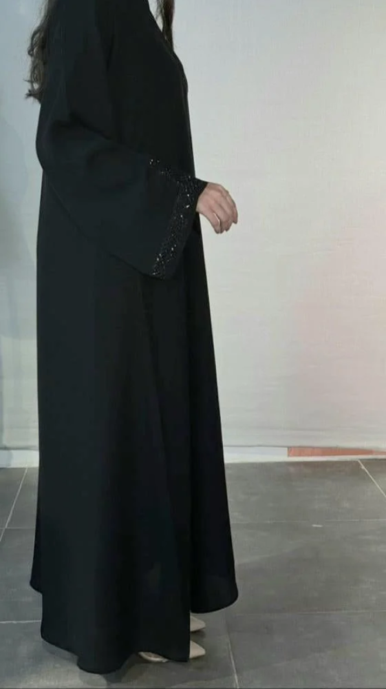 - طول العباية: يُقاس من الكتف إلى أسفل الكعبين (من الأمام).
